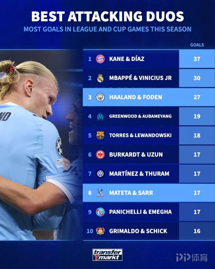 本賽季雙人組進球榜:凱恩迪亞斯37球居首 哈蘭德福登第三