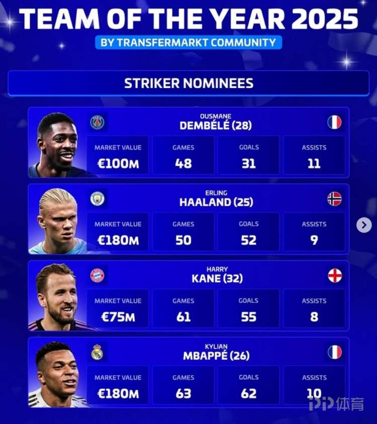 德轉評年度最佳中鋒名單:登貝萊、哈蘭德、凱恩、姆巴佩