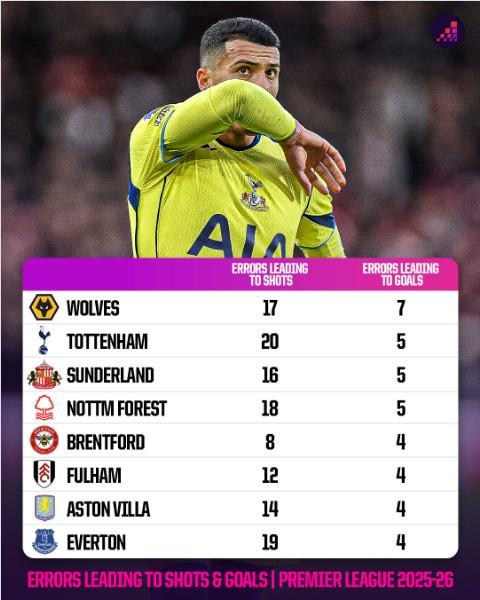 根據(jù)統(tǒng)計(jì),到目前為止,在本賽季的英超聯(lián)賽中,熱刺已經(jīng)出現(xiàn)了5次導(dǎo)致對方進(jìn)球的失誤,僅次于狼隊(duì)的7次。熱刺還在導(dǎo)致對方射門的失誤次數(shù)方面位居聯(lián)賽首位,共有20次。
